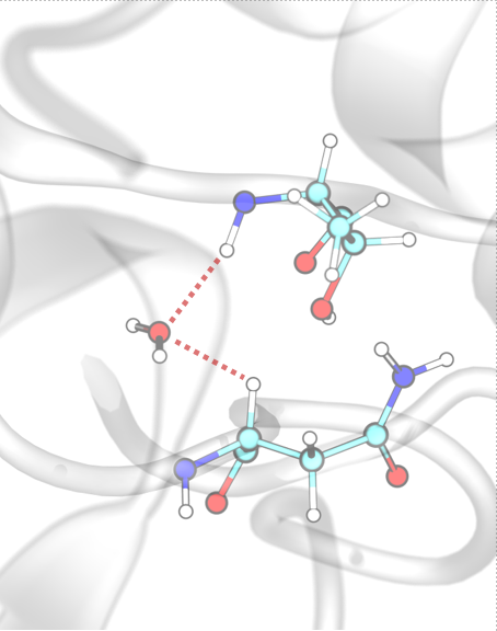 InterMaps detects first-order water-mediated interactions (water bridges) when two residues form hydrogen bonds with the same water molecule. The criteria for hydrogen bond formation are the same as those defined for conventional hydrogen bonds.